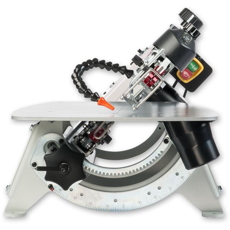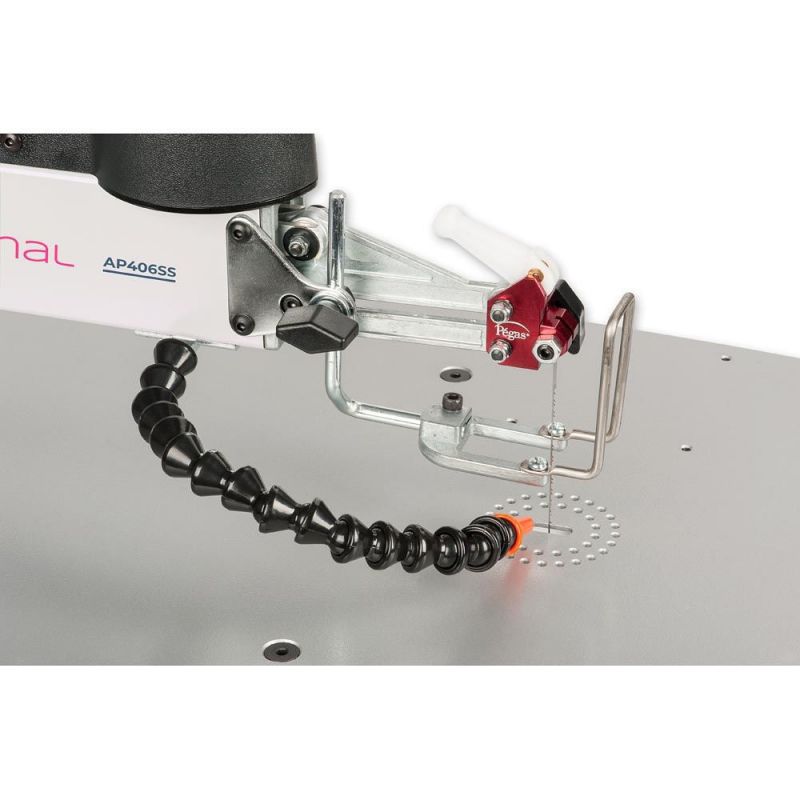 - The arm assembly tilts up to 45° to the right and 35° left leaving the table horizontal. With your workpiece level, you automatically have greater control and precise cuts are easier to achieve. Visibility is improved and work carried out in a natural position. The saw has a 305mm x 470mm, heavy gauge, epoxy coated plate steel table, giving plenty of support to larger workpieces. Blade changing could not be made easier. No tools required, PEGAS blade clamps are lightweight, reduce vibration and reduce stress on the machine. Changing a blade is a simple matter of operating a quick release lever. When carrying out pierced work, you can raise the upper arm to give yourself more clearance to thread the blade through the hole in the workpiece.
