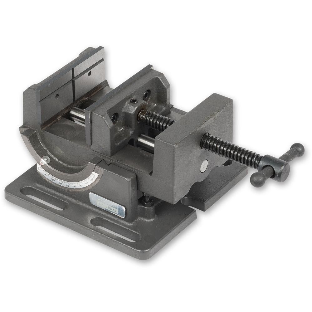 - These 100mm wide cast iron drill vices will tilt at any angle between zero and 90°, clamping securely in position for both drilling angled holes and light duty milling. The tilt action is really smooth, with no discernable movement in the dovetail slides when locked. The calibrated quadrant with locking lever allows easy setting of required angles and, with 6 slots in the base for clamping, this vice a perfect companion for most milling machine and pillar drill tables. Fitted with hardened and ground steel jaws that open to 108mm.