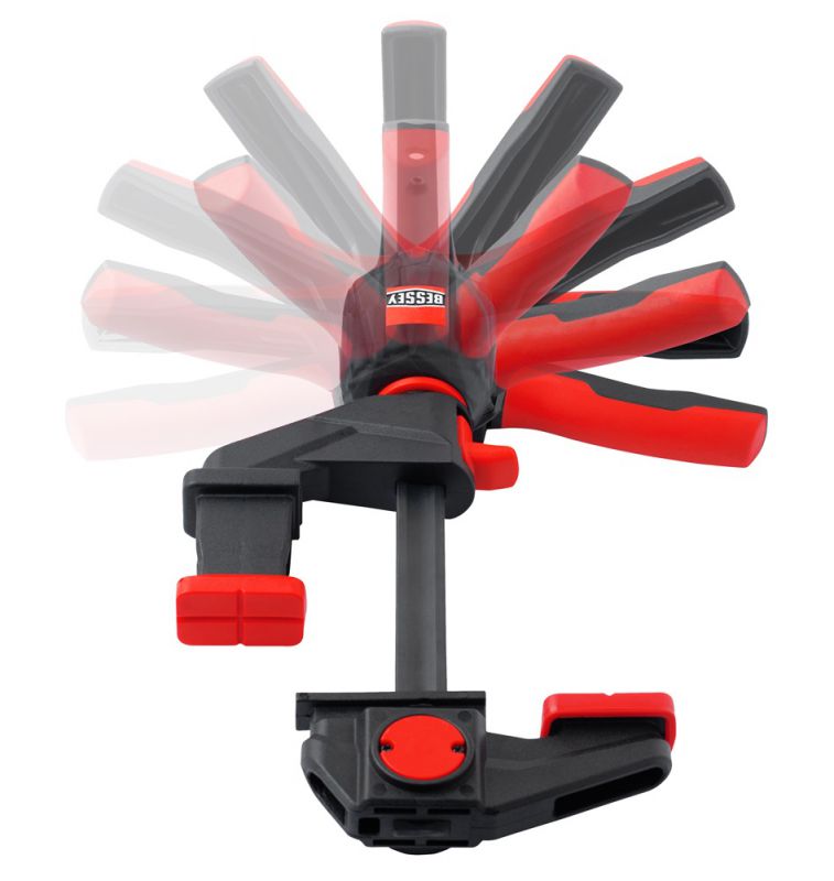 On the one hand, the handle can be positioned in such a way that an optimum pumping position and therefore better application of force is achieved. Secondly, the handle can also be swiveled out of the working area after the clamping process, allowing several clamps to be positioned in the tightest of spaces when used as a one-handed clamp: