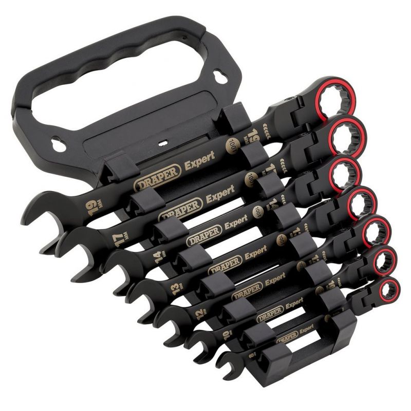 • The Draper Expert HI-TORQ® metric flexible head ratchet combination spanners in this seven-piece set are manufactured from hardened and tempered chrome vanadium steel, with black electroplating for corrosion protection.