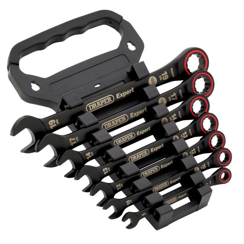 • The Draper Expert HI-TORQ® metric ratchet combination spanners in this seven-piece set are manufactured from hardened and tempered chrome vanadium steel, with black electroplating for corrosion protection.