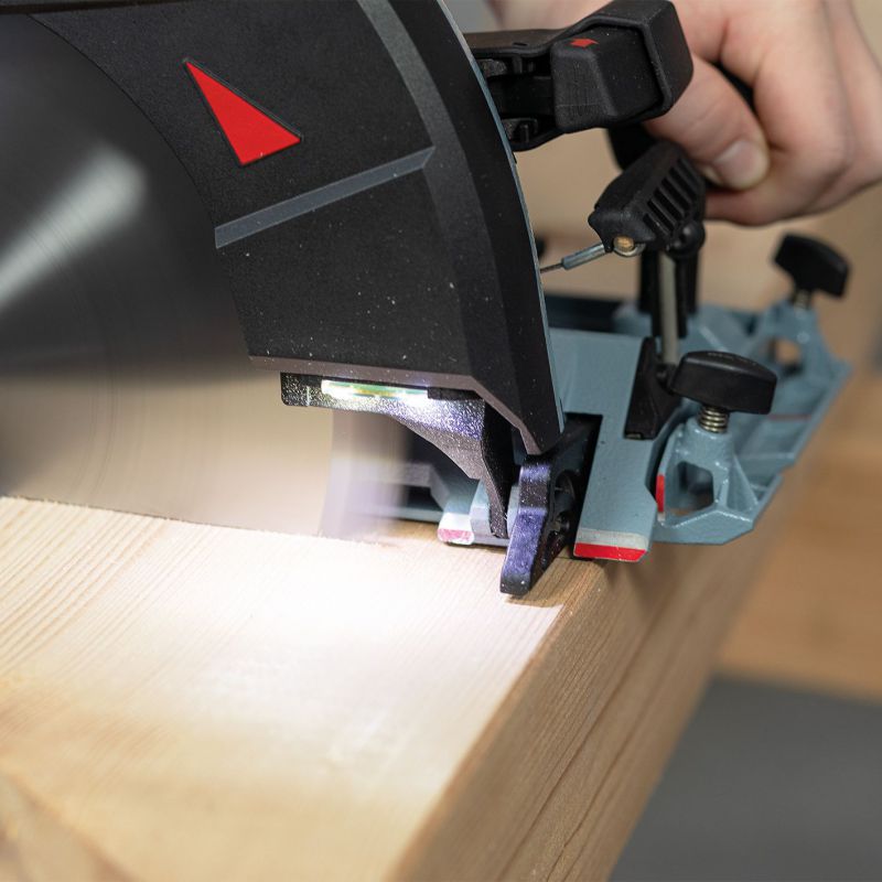 - Sawing to mark. The pointer adjusts automatically to the set tilt angle.