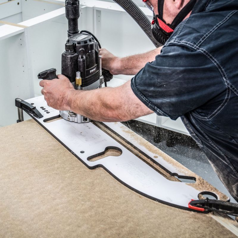 - Requires: ½”/12mm Plunge Router (50mm plunge depth), ½”/12mm Router Cutter (12.7mm cut diameter x 50mm cut length), 30mm Guide Bush, and 2 x clamps.