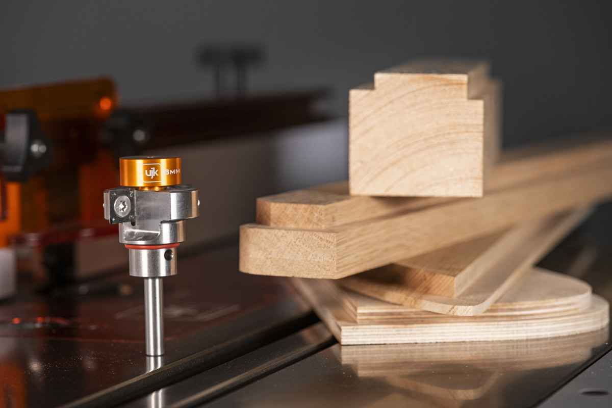 The UJK Rebate Router Cutter Small is a British-made, innovative tool designed to deliver precision, durability, and smooth, clean cuts, making it a valuable addition to any workshop. It's perfect for both handheld and router table use, making it a versatile choice for any woodworking project. Featuring a square, replaceable blade on two flutes and a blocking pin for safe depth disc changes, this cutter ensures precision and safety. Its ground breaking Internal Bearing Technology (IBT) provides superior running balance and protection from dust and debris, resulting in a smoother cutter and longer lifespan.