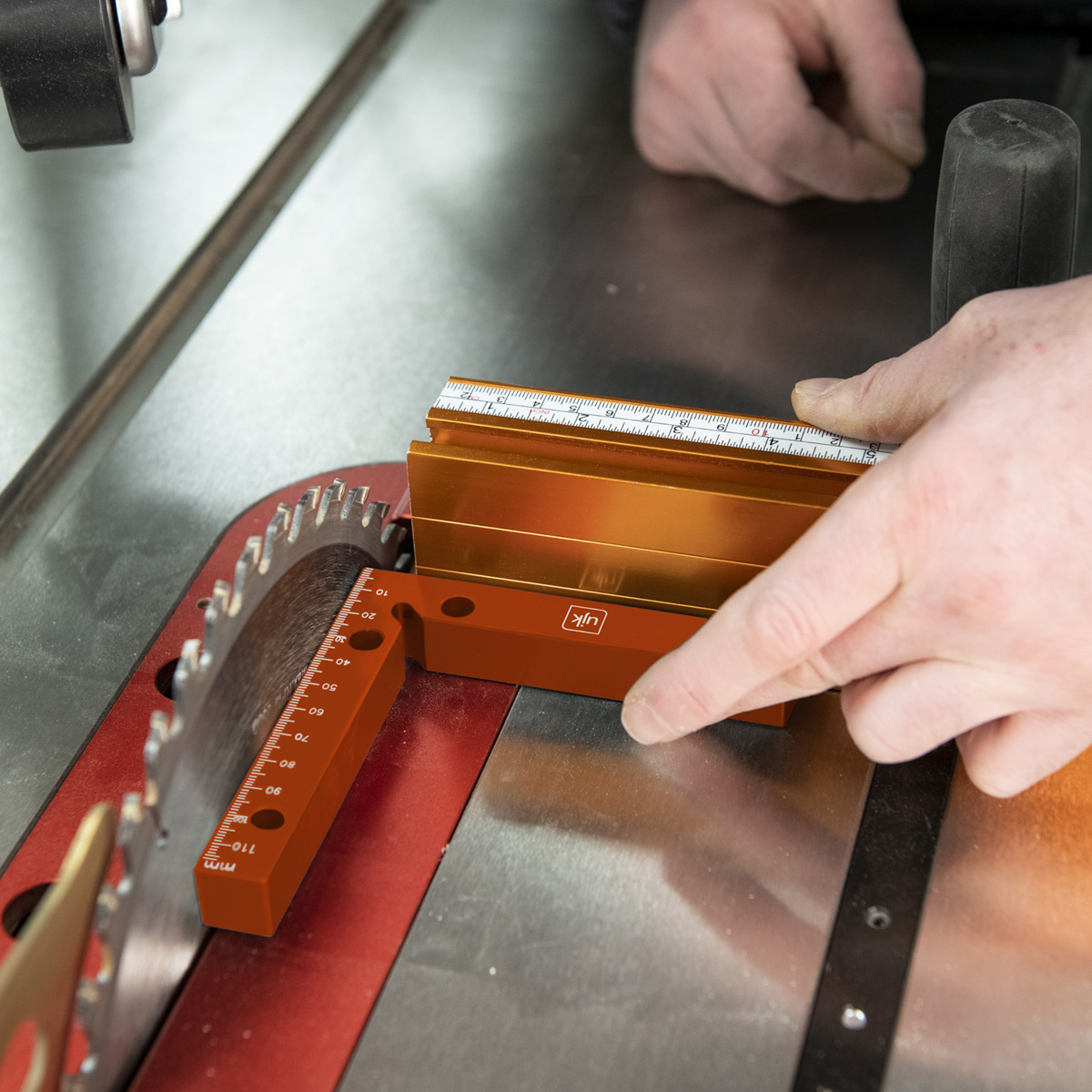 The UJK Assembly squares streamline your setup, ensuring saws, bandsaws, and fences are at precisely 90°. The graduated arm, marked in both metric and imperial, starts at the corner, doubling as a height gauge. Clamp them to secure drawer or box corners, on internal and external angles. The notched corner ensures full contact for accuracy, while the holes accommodate UJK Fence Clamps for a seamless clamping.