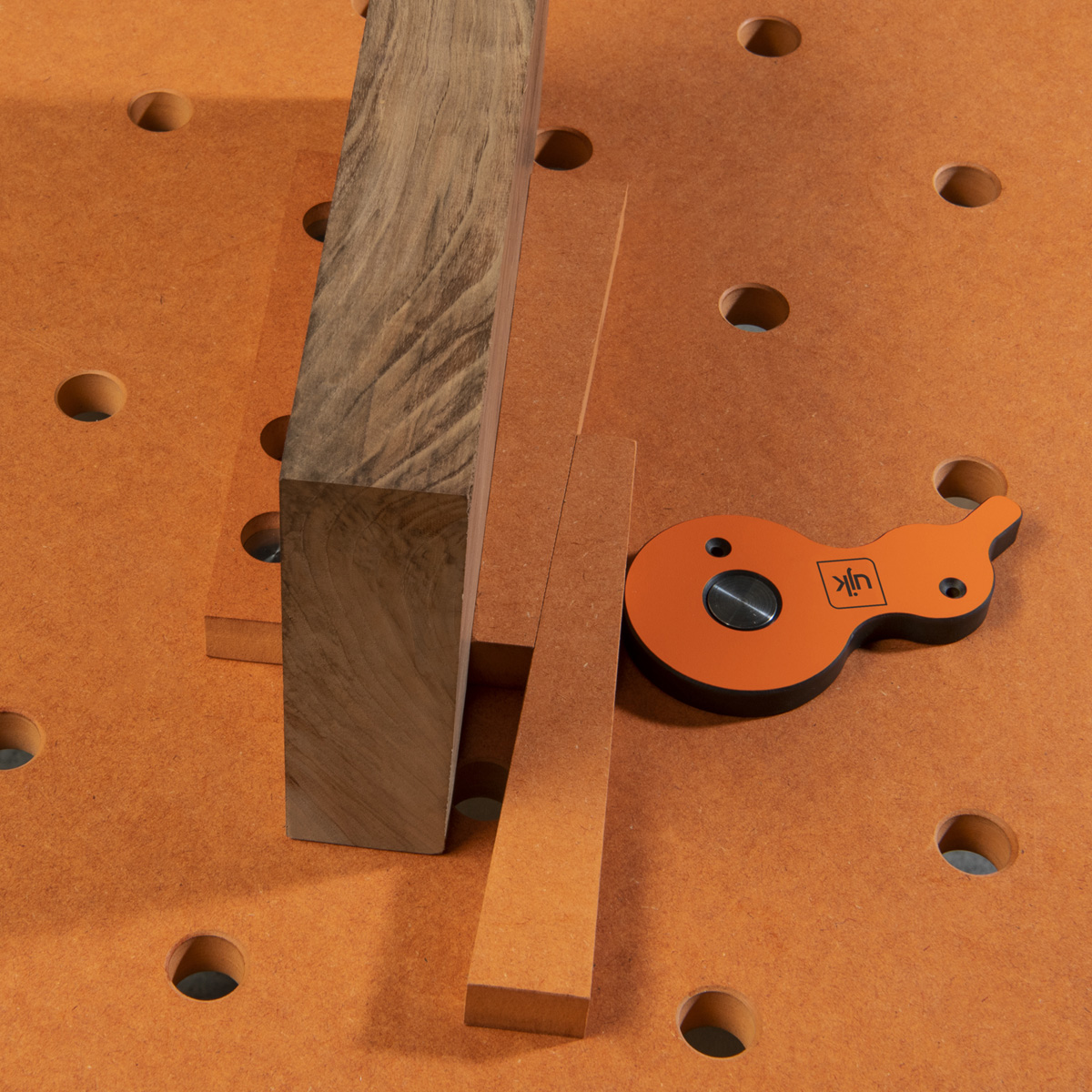 The UJK Backstop is a CNC-machined precision tool crafted from durable 20mm HDF Valchromat. Designed for flexibility, it features three dog holes, two for standard lateral or longitudinal placement at 96mm centres, and one for diagonal positioning. Use it solo as a planing stop, or pair with a second backstop at 90° or 45° to create a practical assembly jig. Works perfectly with UJK Guide dogs for secure, repeatable setups.