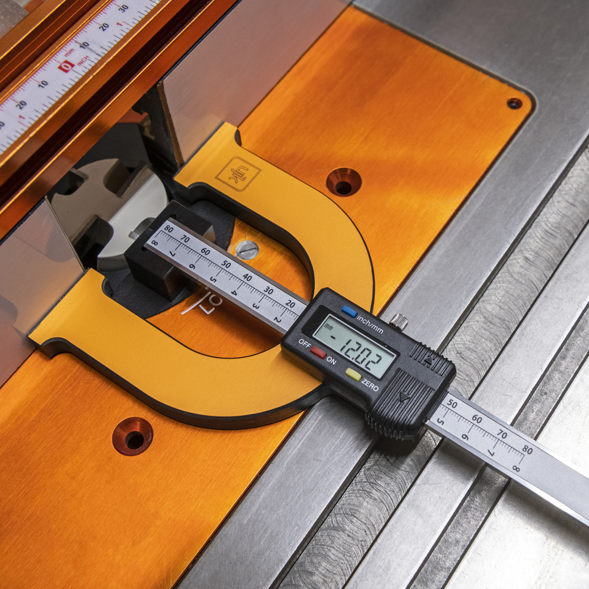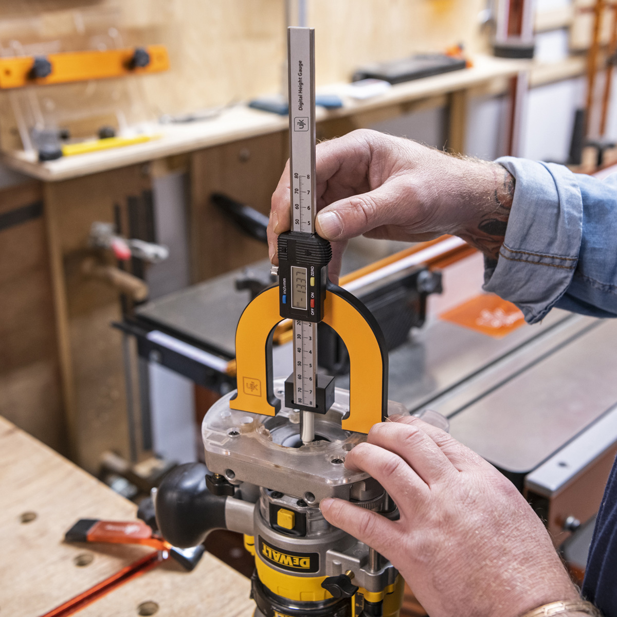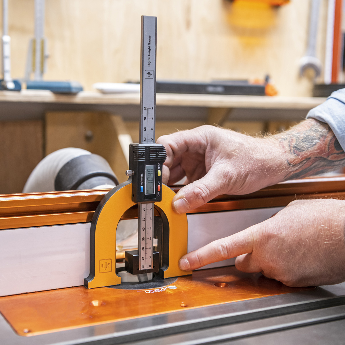 The UJK Digital Height Gauge is the ultimate tool for accurate setting of cutting depths, especially with router cutters and saw blades. Designed for speed, stability, and precision, it gives you confidence in every cut. Manufactured from 12mm thick CNC-machined phenolic, the gauge is highly durable and stable under normal workshop conditions. Its horseshoe-shaped body spans 50mm internally with a vertical range of 55mm. The standout feature is the high-precision digital scale with an easy-to-read LCD display, offering measurements in both metric and imperial. With a resolution of 0.01mm (0.001"), measuring is faster than guessing with a ruler. Zero the display anywhere for relative adjustments and measure vertically or horizontally with equal accuracy. Ideal for setting blade or cutter depth and aligning your router table fence.