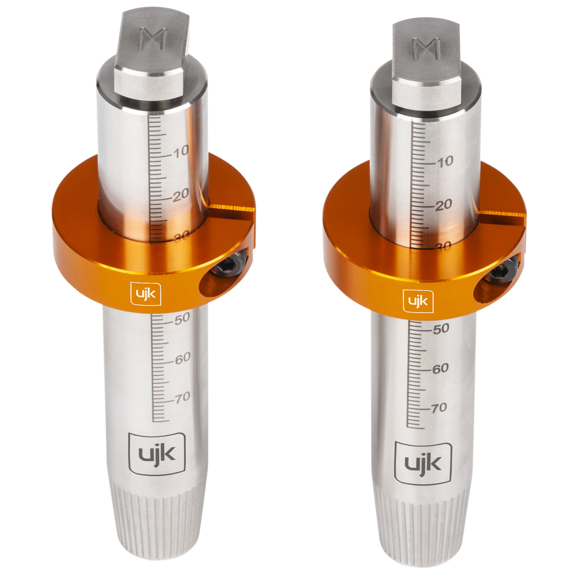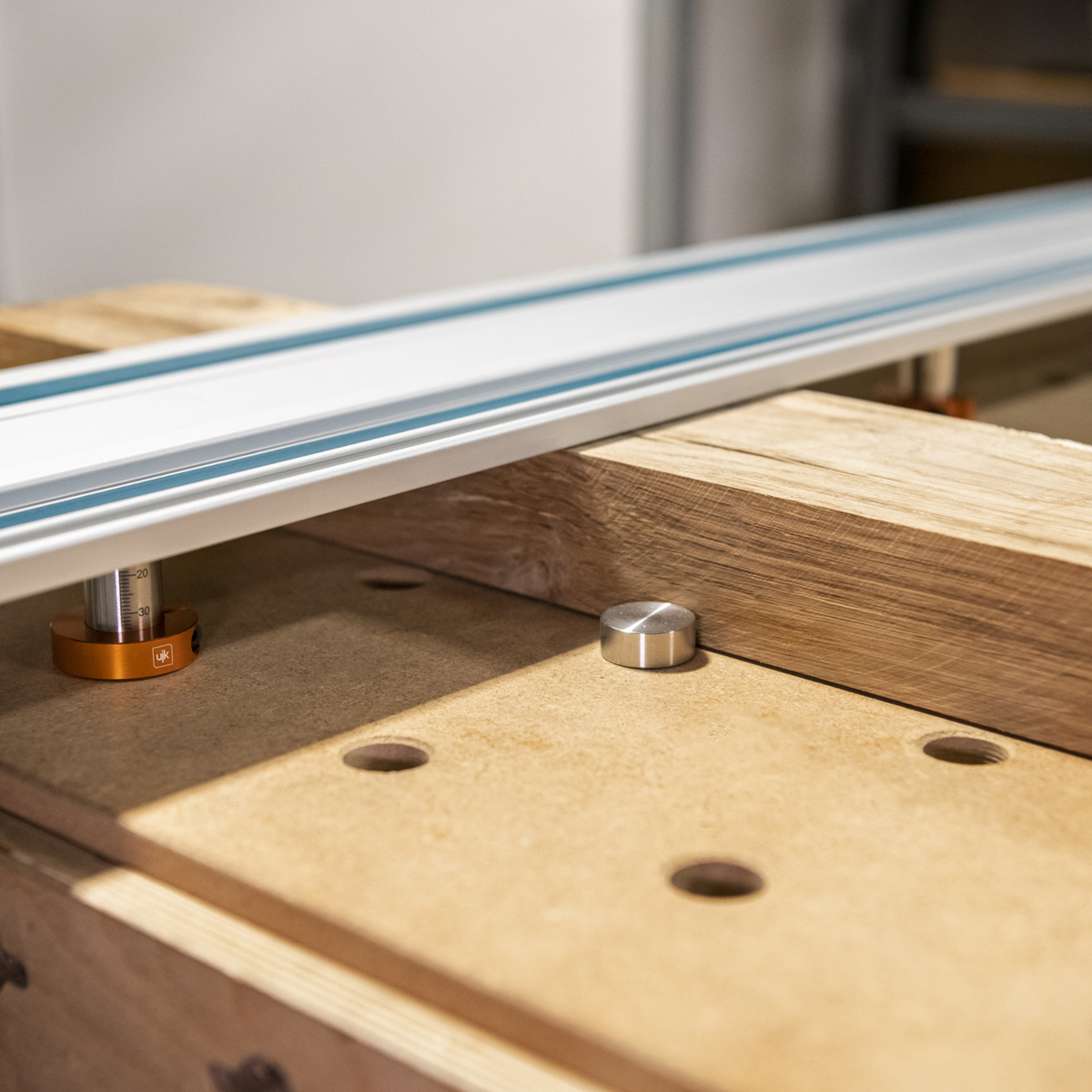 These stainless steel guide rail dogs, hidden beneath the rail, offer superior security and precision. The guide rail dogs prevent saw cutting across other dog holes. Tee-bolt design fits into the rail’s Tee-slot, replacing the need for rail clips. The knurl on the lead taper helps to lock the dog to the rail. Laser-etched 0-75mm scale for wood thickness measurement. Supplied in a pack of 2 with split stop collars to set the wood thickness.