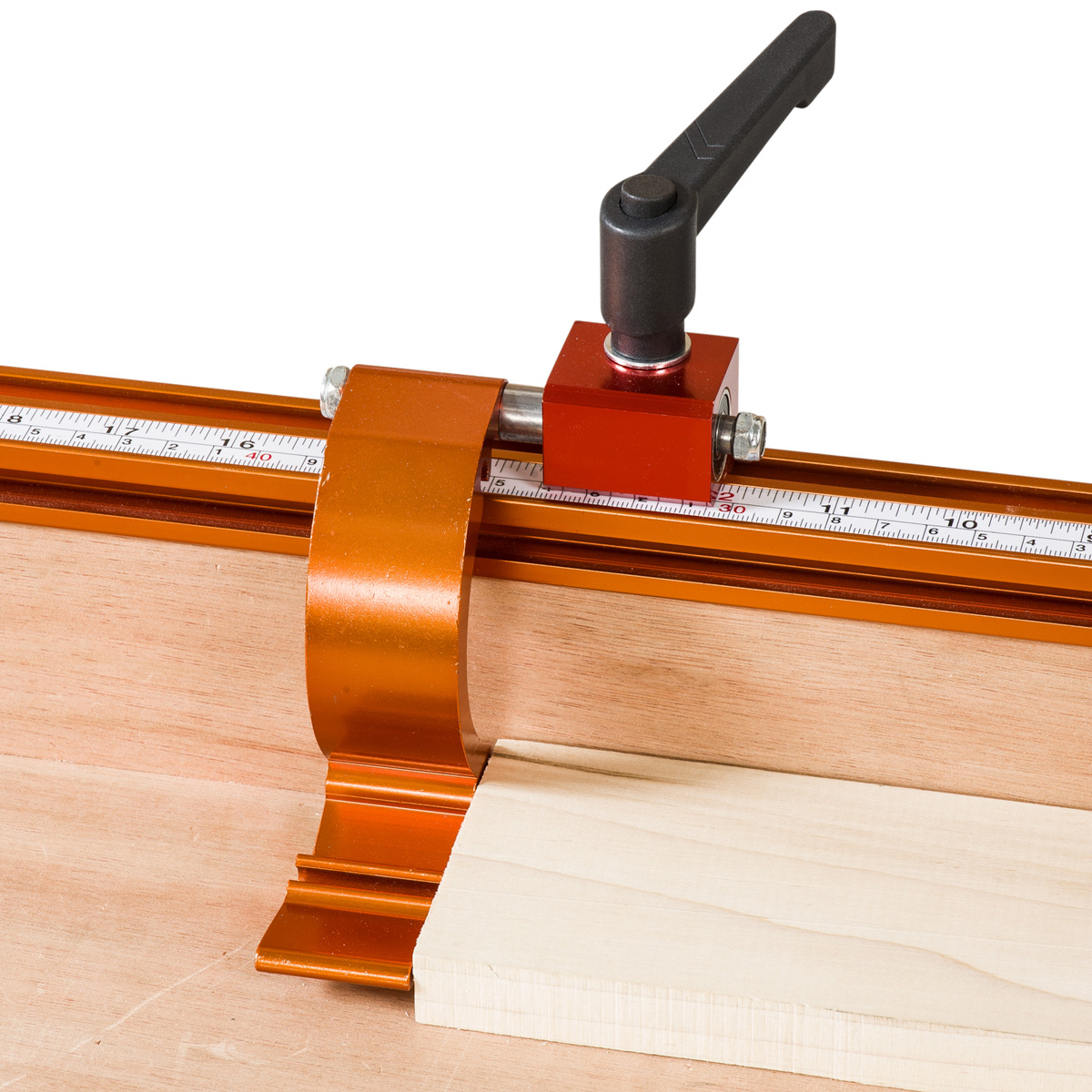 The UJK flip stop fits into an 8mm T-slot. Use it on your existing fence rail. As an additional flip stop with the UJK Track & Stop it gives you the potential of having two common length settings without the need to reset from one to the other. Made from an anodised aluminium extrusion, it comes with a Bristol locking handle for quick and easy re-positioning.