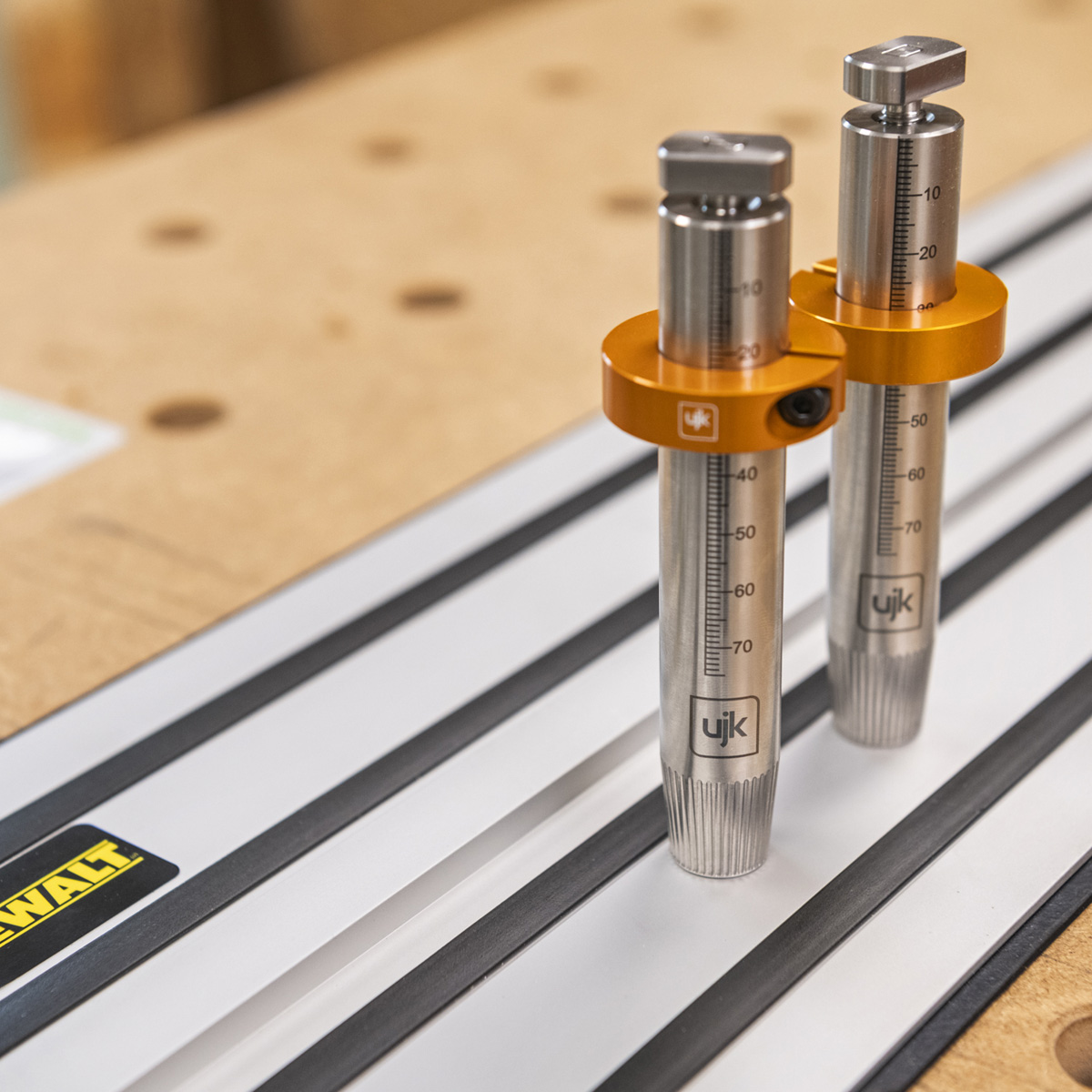 These stainless steel guide rail dogs, hidden beneath the rail, offer superior security and precision. The guide rail dogs prevent saw cutting across other dog holes. Tee-bolt design fits into the rail’s Tee-slot, replacing the need for rail clips. The knurl on the lead taper helps to lock the dog to the rail. Laser-etched 0-75mm scale for wood thickness measurement. Supplied in a pack of 2 with split stop collars to set the wood thickness.