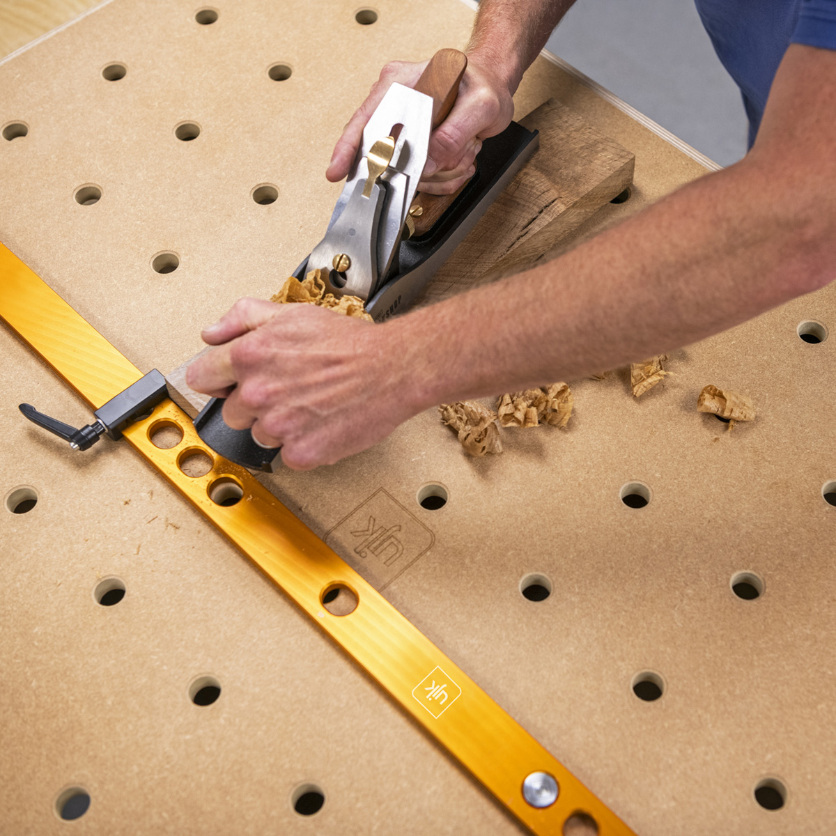 The UJK MRMDF Top for Bench dogs is 18mm thick, moisture resistant MDF. This material is versatile, lightweight and ideal for workshops with varying humidity. The UJK MRMDF top has a grid of 20mm plain chamfered dog holes: 11 holes x 7 holes 96mm apart. These holes are CNC machined to guarantee accuracy, aligned lengthways and widthways with the rows perfectly square to each other. These dog holes allow you to use bench dogs and many other accessory clamps, guide rails and stops to hold, saw, rout and machine your work with perfect accuracy. Made from 18mm thick MRMDF, the 1,102mm x 718mm top fits perfectly in the UJK Multifunction workbench frame or the Festool MFT base. This makes it a suitable replacement for the standard Festool top.