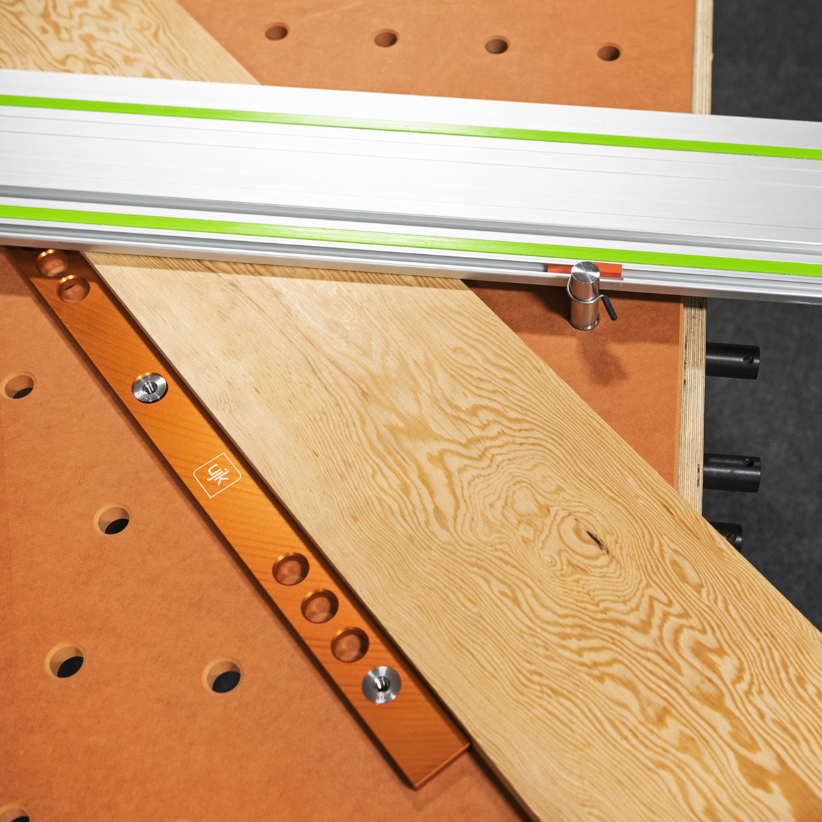The UJK Parf System Fence & Stop Kit ensures a steady workbench setup, removing the need to adjust bench dogs for different cut lengths. The adjustable stop delivers consistent, precise cuts, moving the fence by one hole, or 32mm, allows for quick marking or drilling changes, increasing efficiency and precision. Using two fences at a 90° angle assists in assembling cabinet frames or drawers. The fence can also be placed on top of a workpiece and includes a hole for 45° angle settings.