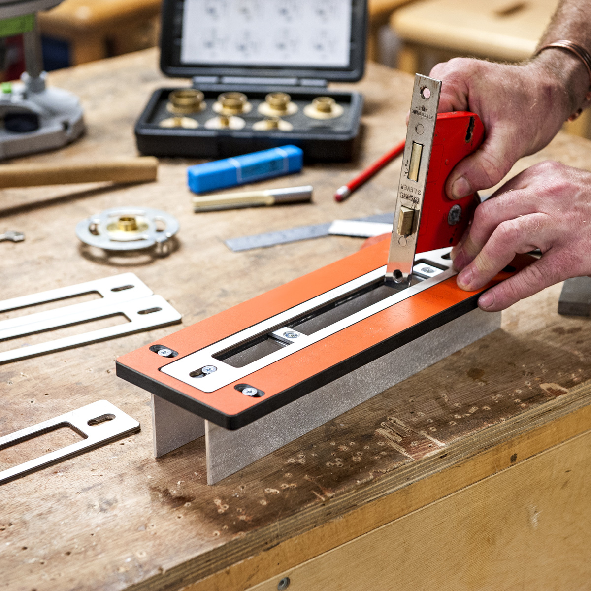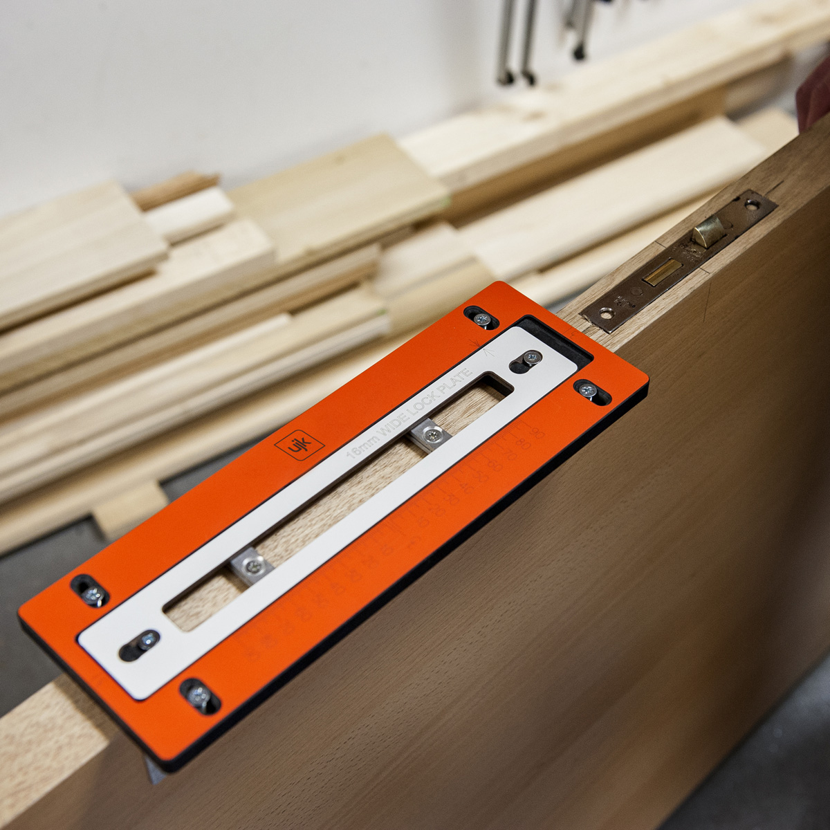 Achieve perfectly square lock mortices quickly and reliably with the UJK Compact Lock Jig, built for accuracy and durability. Made from 12mm high-pressure laminate, it’s dimensionally stable and guaranteed never to warp. Fully adjustable for lock faceplates up to 175 mm, it comes with four interchangeable templates covering the most common sash, mortice, and deadlock sizes. Keyhole slots allow fast template changes, while simple centre-line setup ensures square mortices for precise door fitting. Suitable for doors up to 58 mm (2.1/4") thick, it works with a 1/2" router with a 12.7 mm (1/2") straight cutter, 16mm guide bush, and standard clamps for easy, professional results.